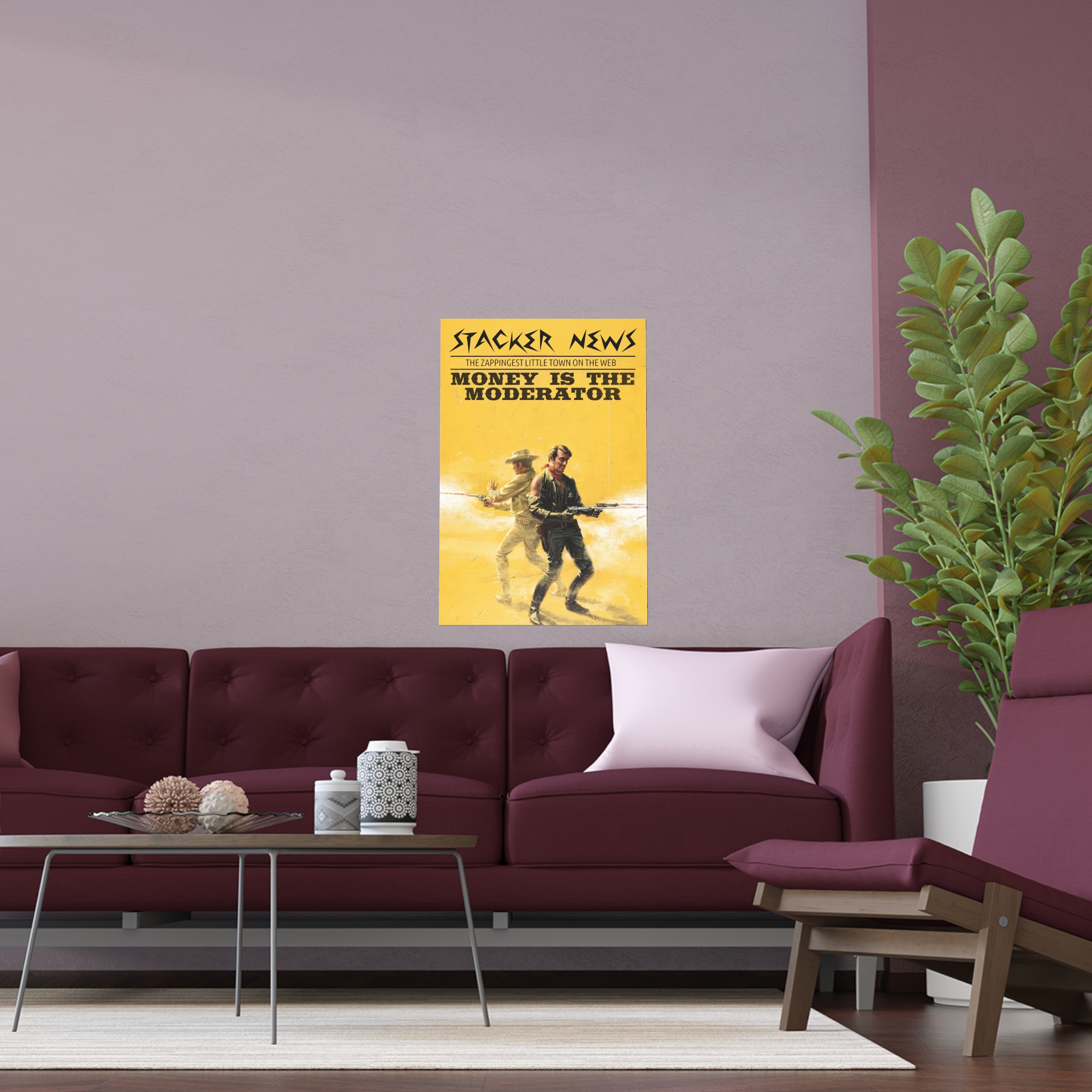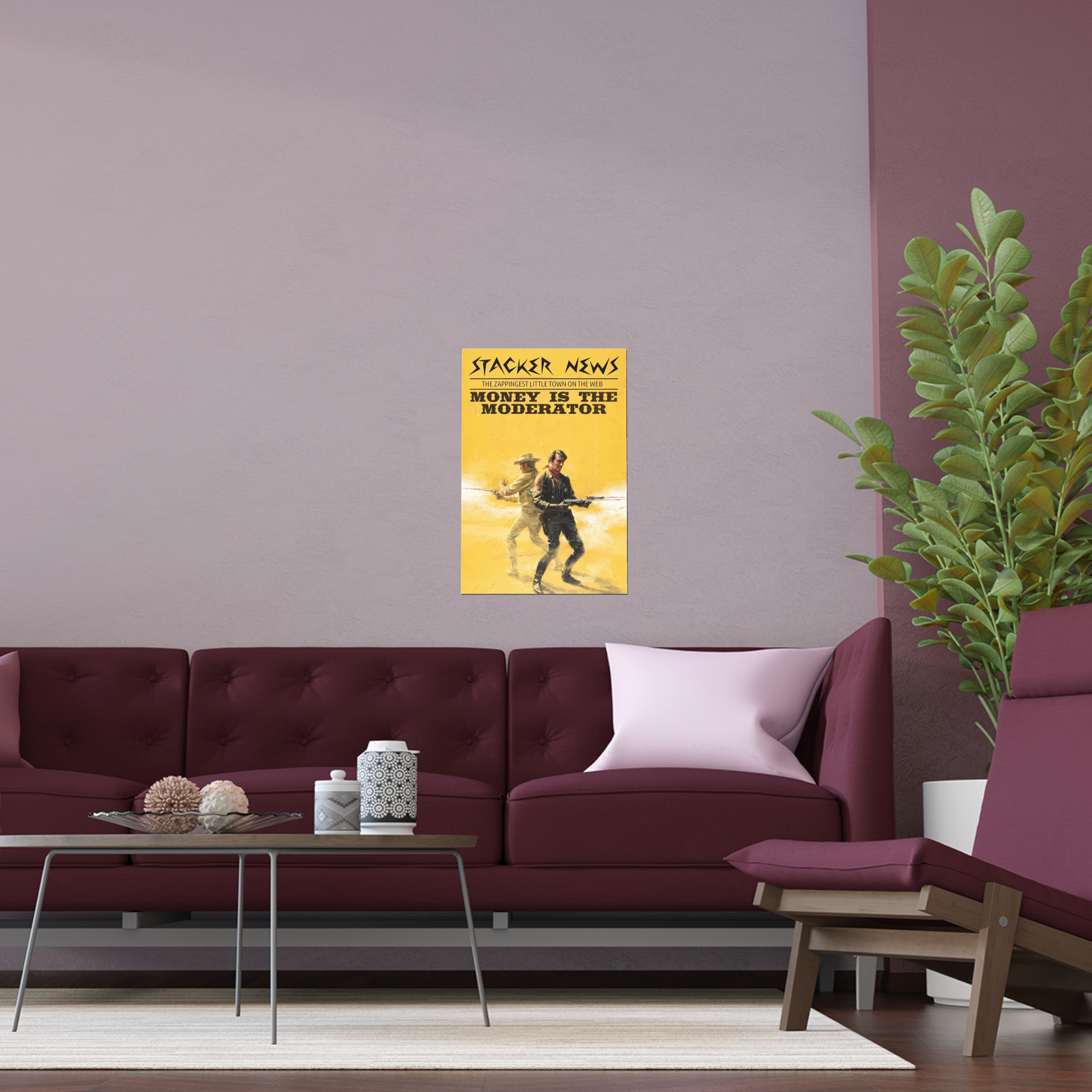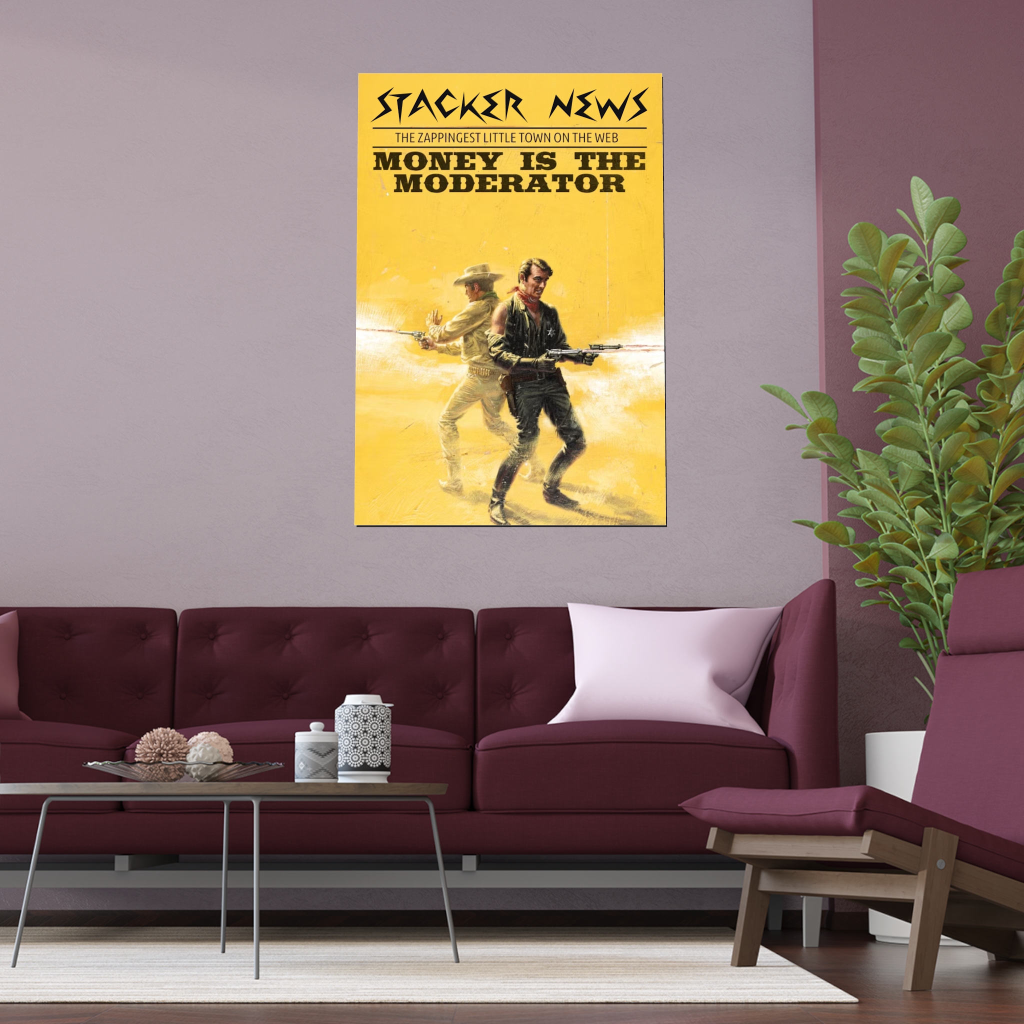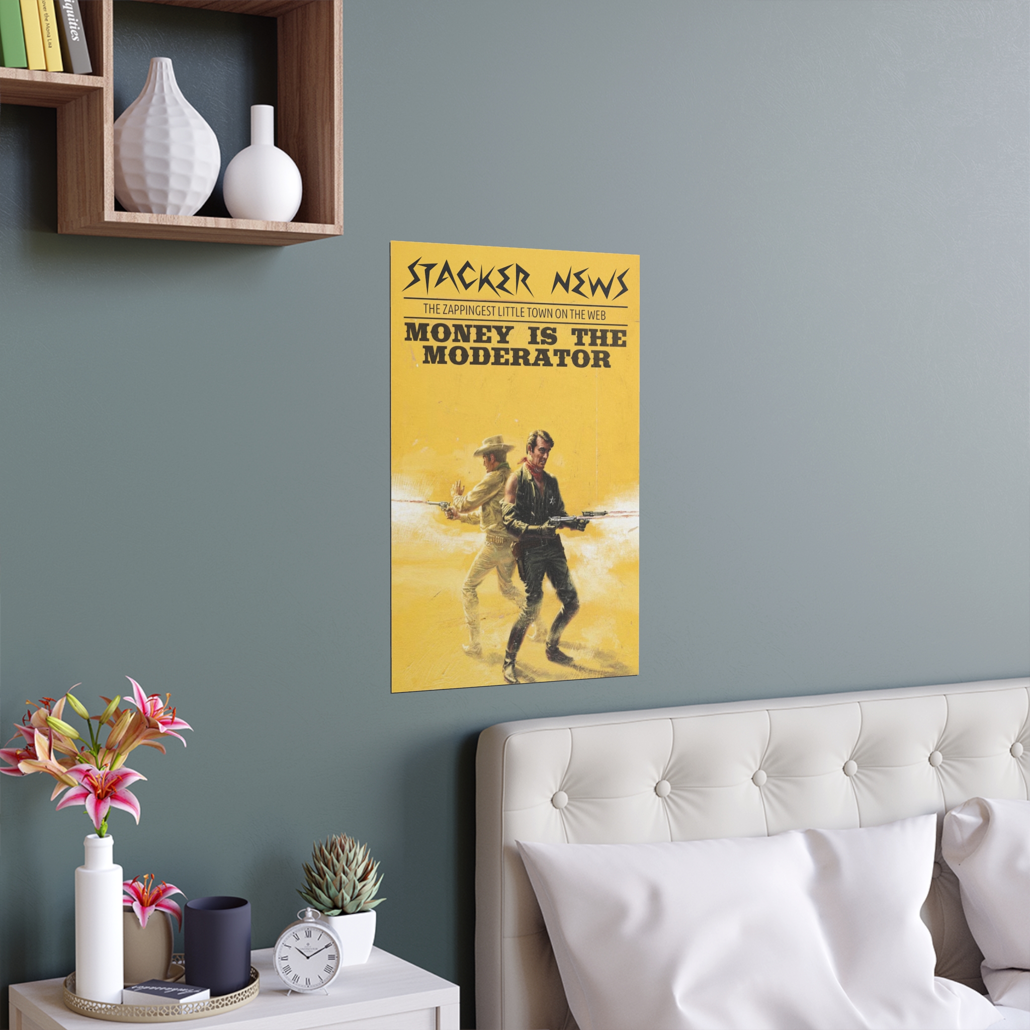 Channel the grit and energy of a vintage western screen with this silk-finish poster from the “The Money is the Moderator” series. Each print feels like a relic from a long-ago theater marquee, reimagined as a STACKER.NEWS advertisement—bold headlines, saturated hues, and that slightly rebellious, cinematic vibes.