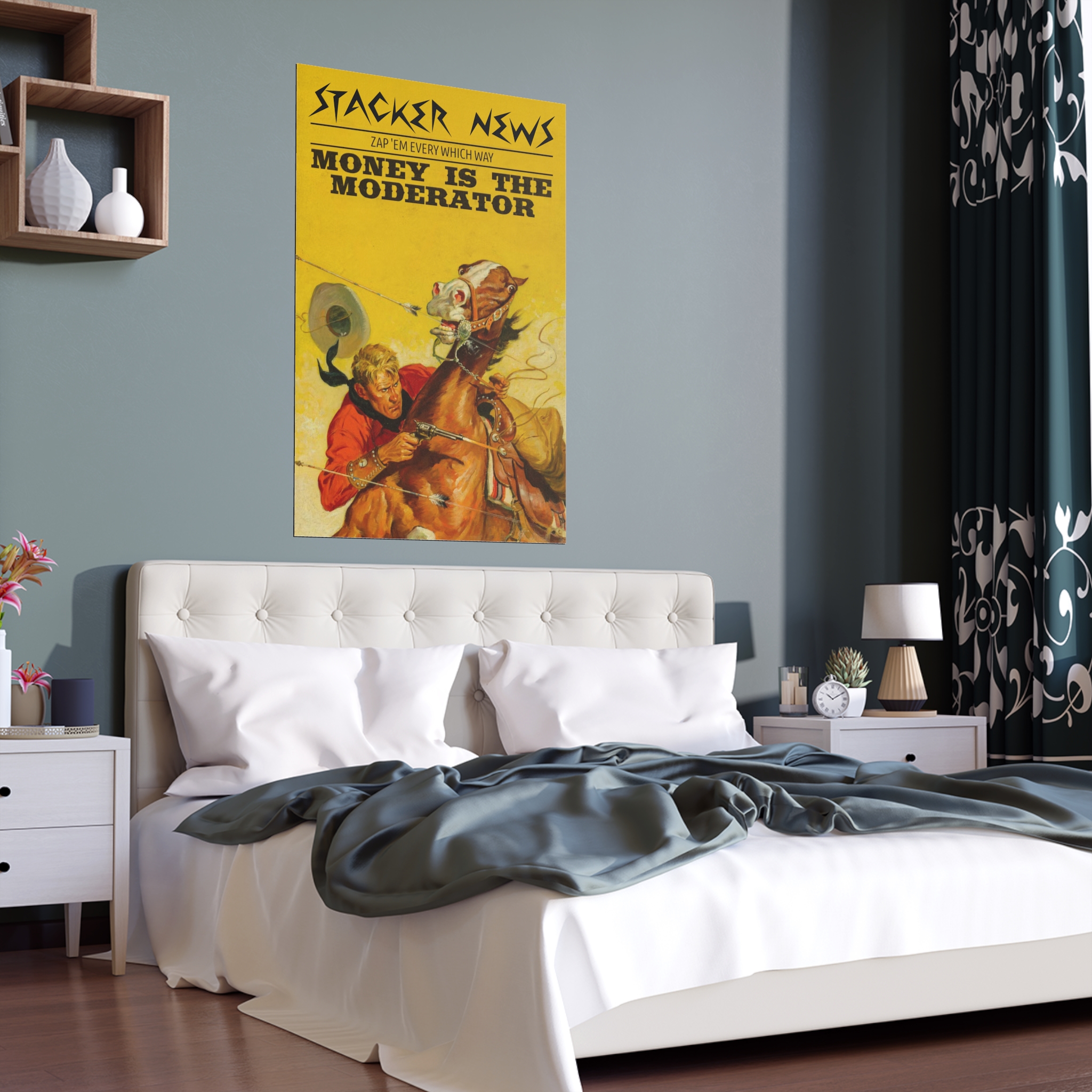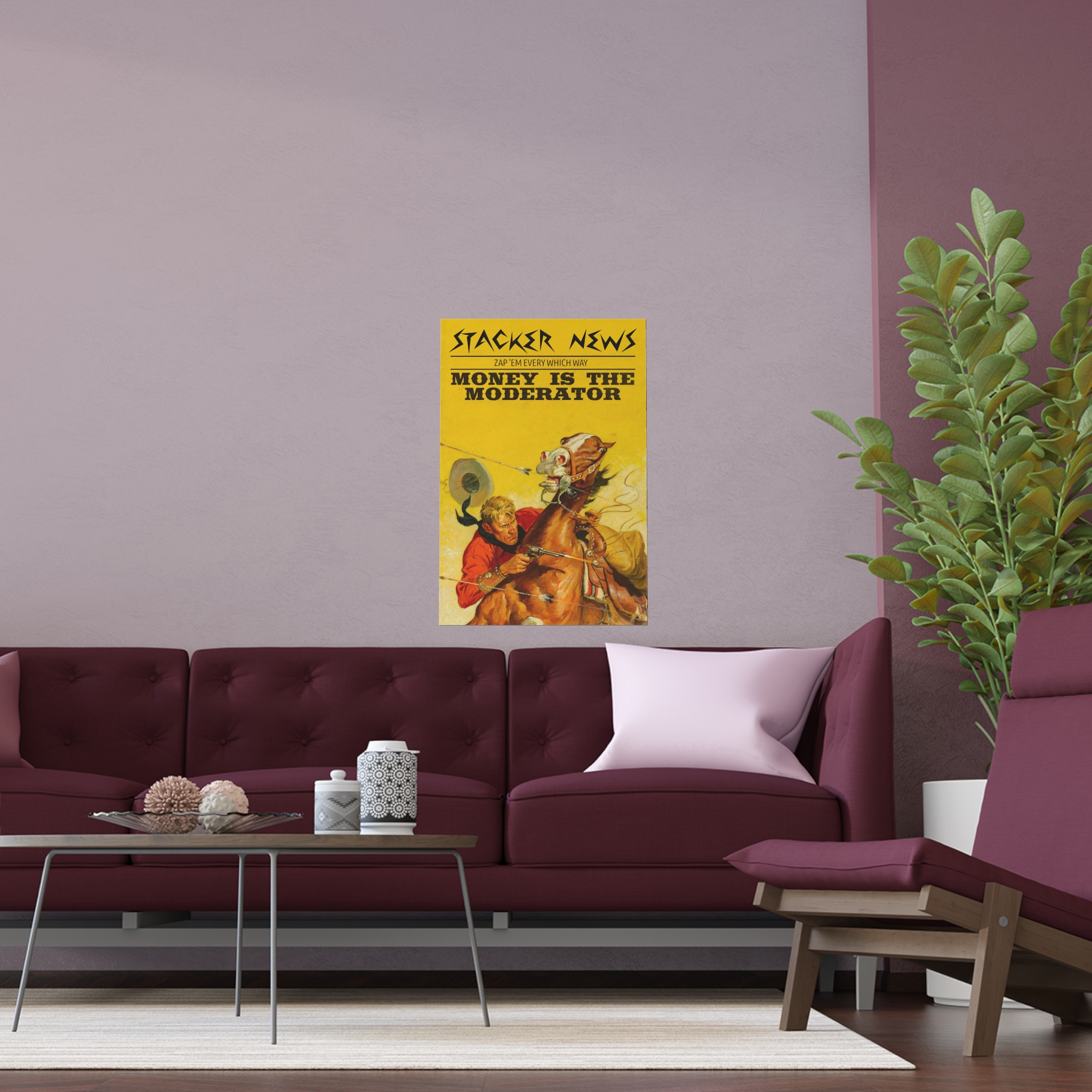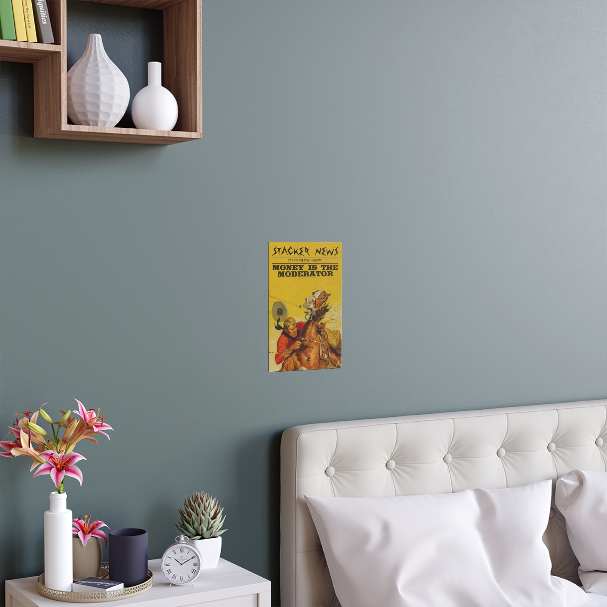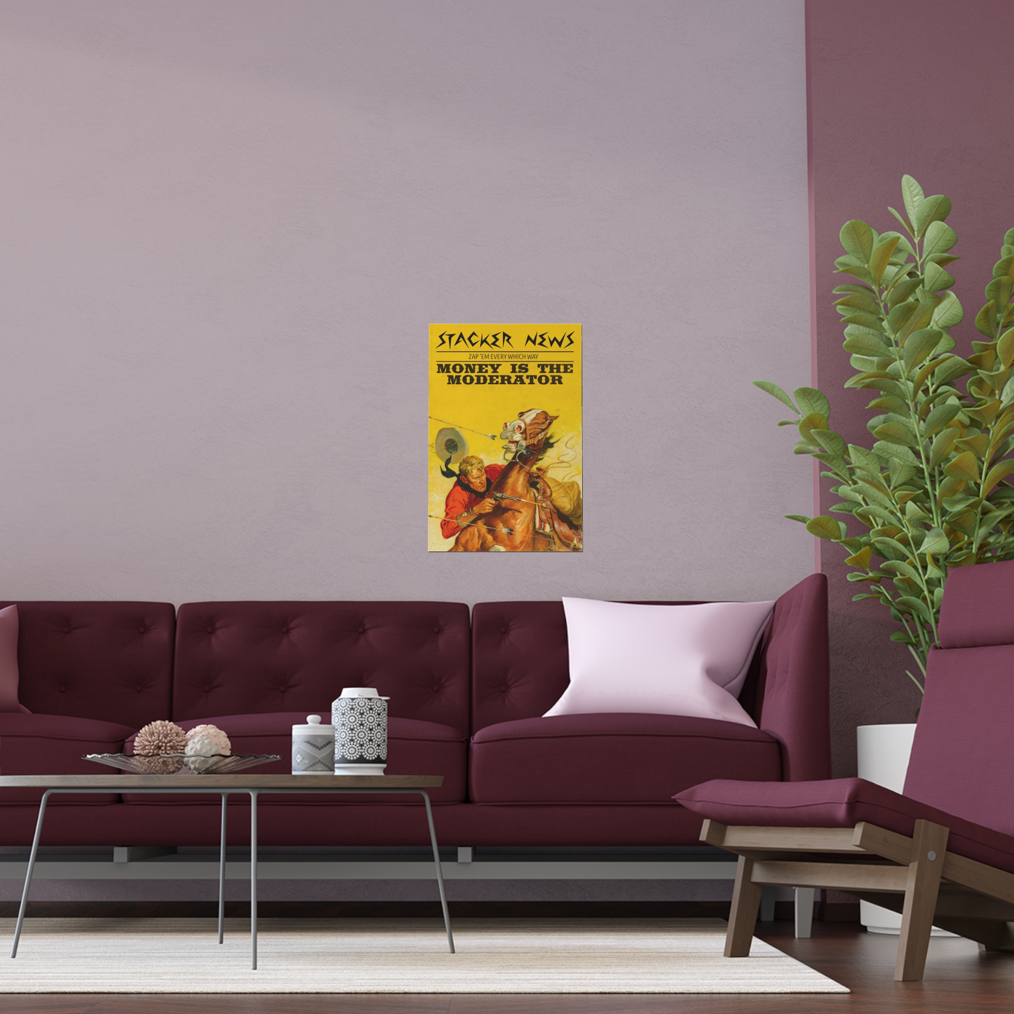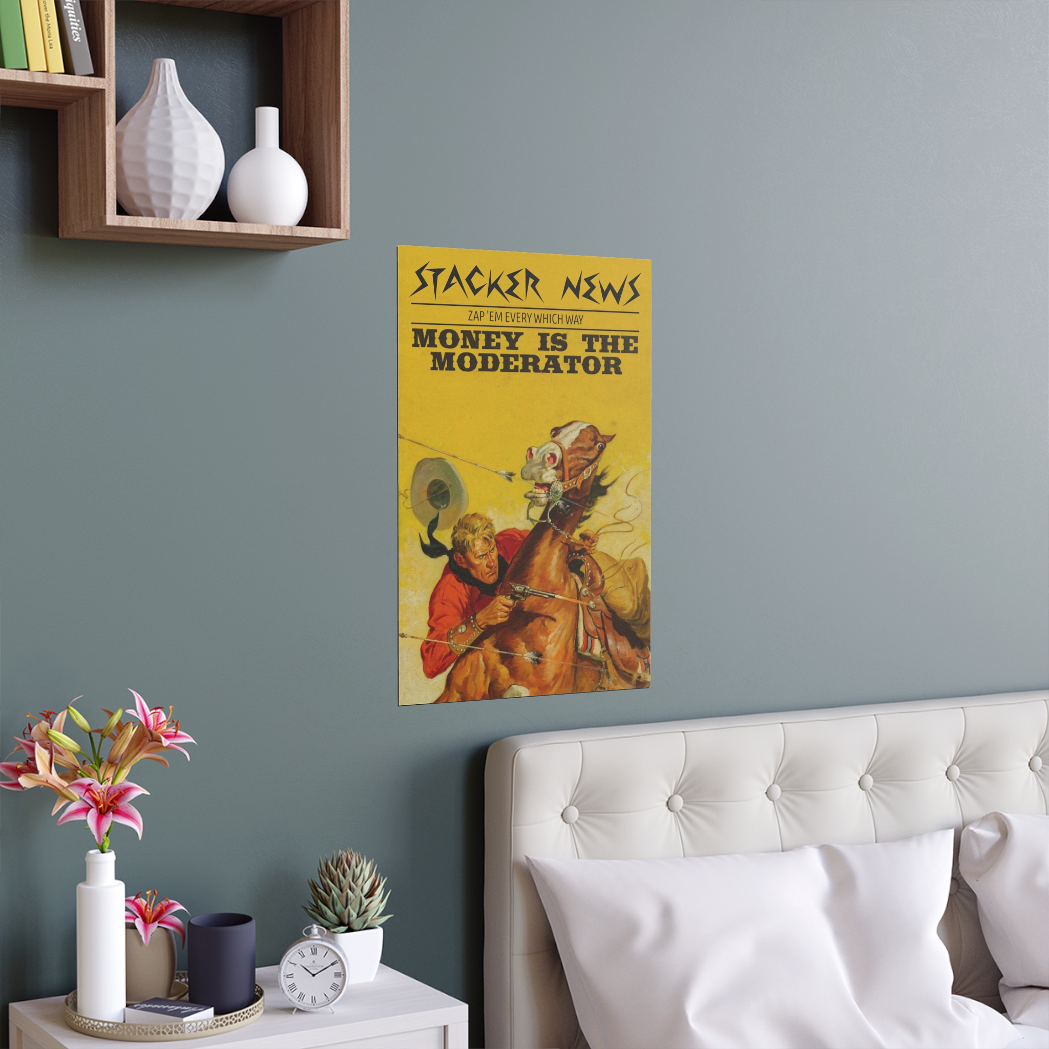 Channel the grit and energy of a vintage western screen with this silk-finish poster from the “The Money is the Moderator” series. Each print feels like a relic from a long-ago theater marquee, reimagined as a STACKER.NEWS advertisement—bold headlines, saturated hues, and that slightly rebellious, cinematic vibes.