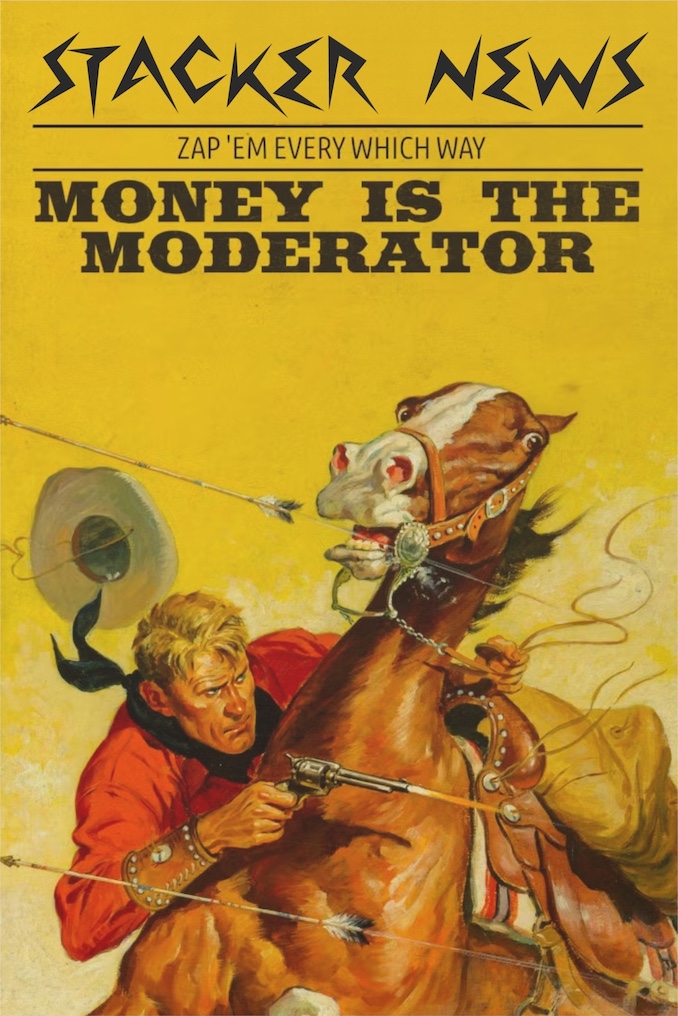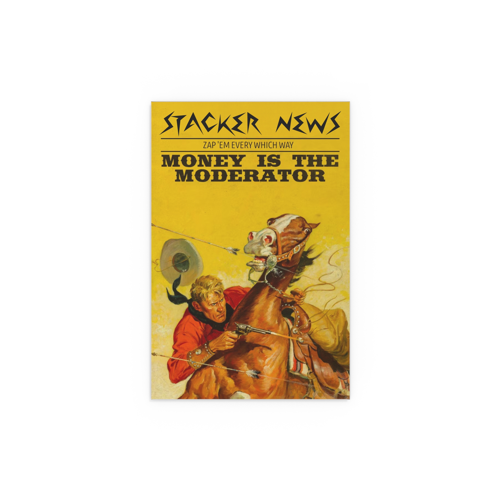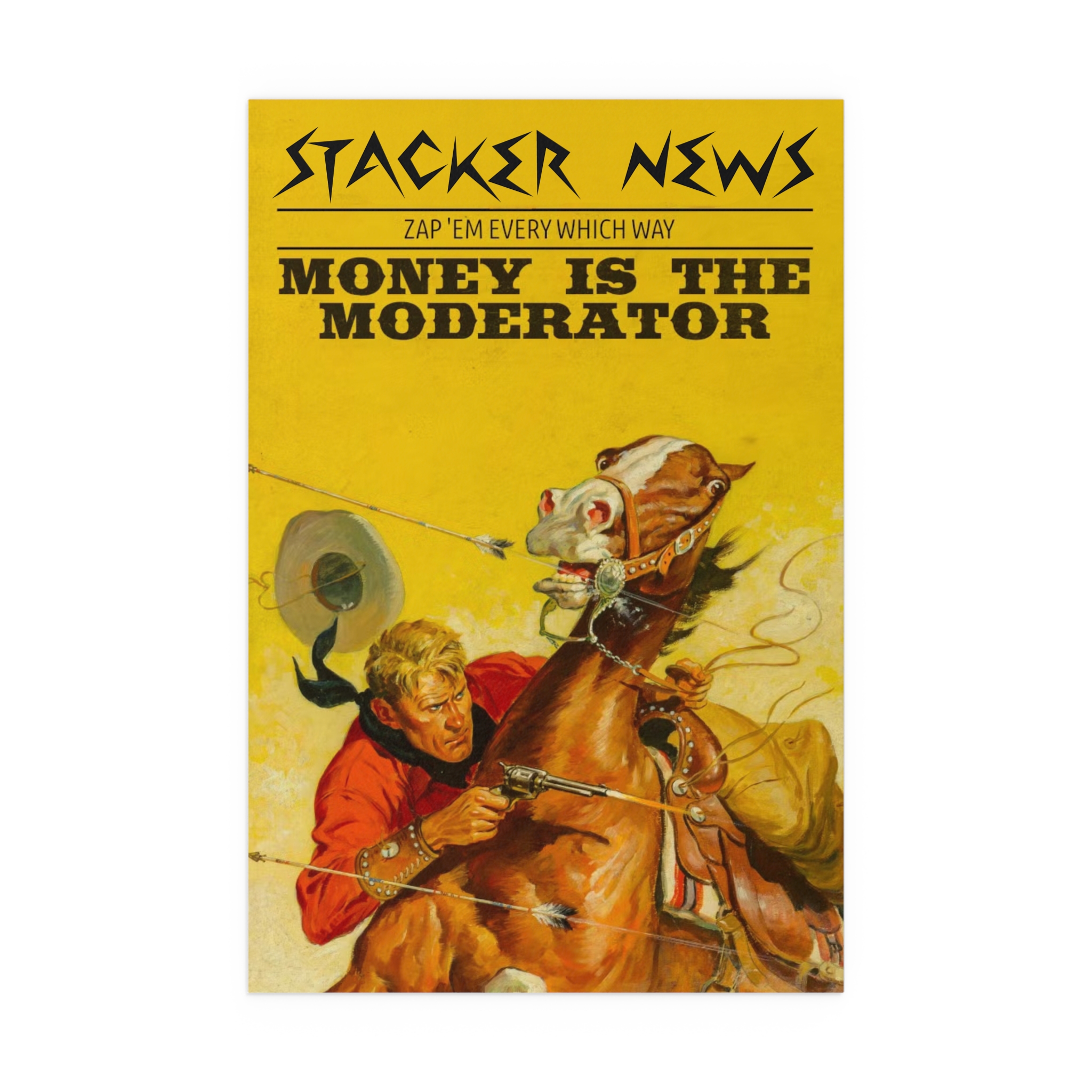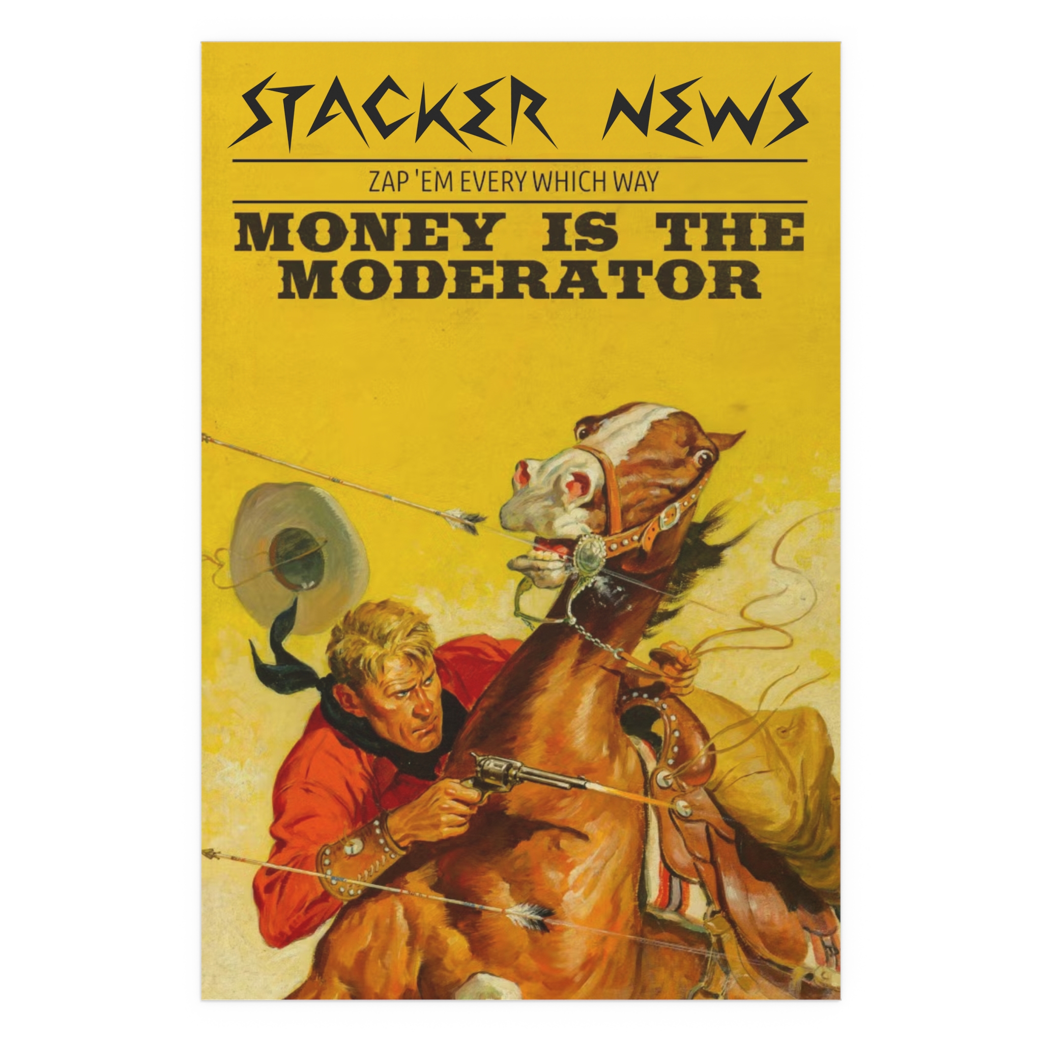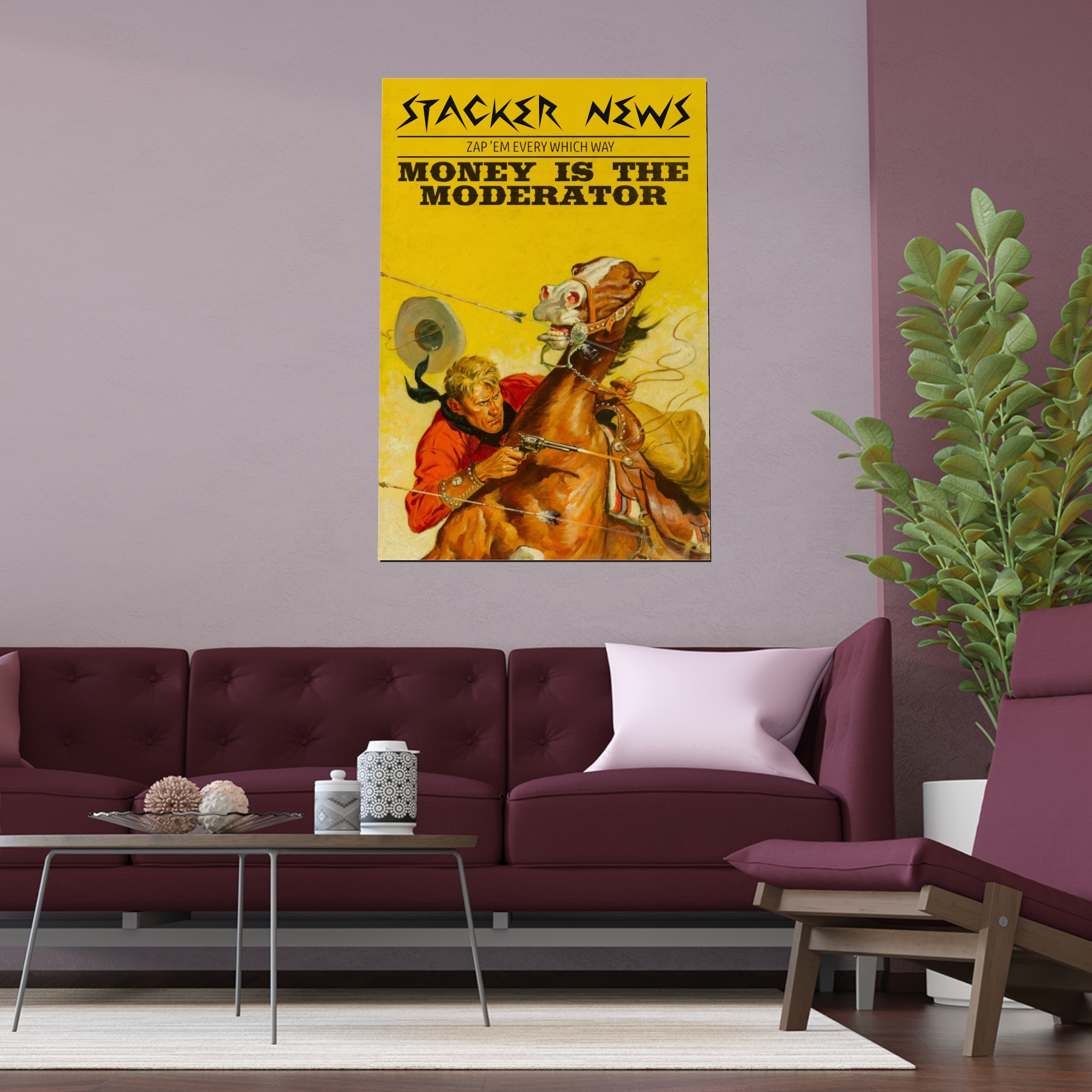 Channel the grit and energy of a vintage western screen with this silk-finish poster from the “The Money is the Moderator” series. Each print feels like a relic from a long-ago theater marquee, reimagined as a STACKER.NEWS advertisement—bold headlines, saturated hues, and that slightly rebellious, cinematic vibes.