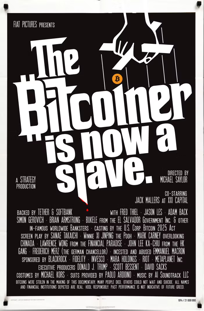 a STRATEGY production – Directed by MICHAEL SAYLOR – Co-starring JACK MALLERS at XXI CAPITAL backed by TETHER & SOFTBANK with FRED THIEL · JASON LES · ADAM BACK SIMON GEROVICH · BRIAN ARMSTRONG · BUKELE from the EL SALVADOR Government Inc. & other in-famous worldwide Banksters · Casting by the U.S. Corp. Bitcoin 2025 Act - Screen play by SANAE TAKAICHI · Winnie XI JINPING the Pooh · MARK CARNEY overlooking CHINADA · LAWRENCE WONG from the FINANCIAL PARADISE · JOHN LEE KA-CHIU from the HK GANG · FREDERICH MERZ (the german chancellor) · incested and abused EMMANUEL MACRON sponsored by BLACKROCK · FIDELITY · INVESCO · MARA HOLDINGS · RIOT · METAPLANET Inc. – Executive producers DONALD J. TRUMP · SCOTT BESSENT · DAVID SACKS costumes by MICHAEL KORS & suits provided by PAOLO ARDOINO music by AI Soundtrack LLC – Bitcoins were stolen in the making of this documentary, many people died, others could not wait and suicide. All names and financial institutions depicted are real. HODL responsibly. Past performance is not indicative of future greed.